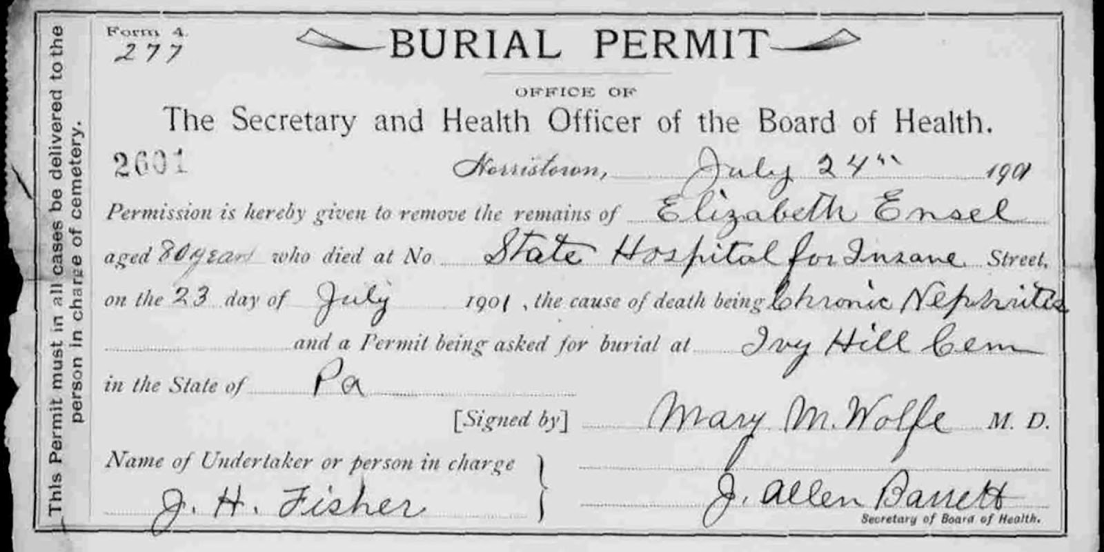 Elizabeth died at the Norristown asylum on July 23, 1901. The cause of death was listed as chronic nephritis.9 She had most likely been in one institution or another for 33 years - more than half of her adult life.